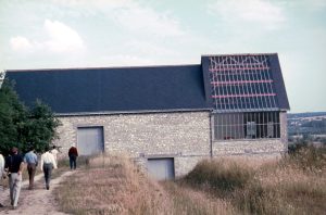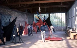 Jean Claude DROUIN, architecte-urbaniste, responsable de l’Atelier d’urbanisme de l’Agglomération Tourangelle a invité l’équipe de l’OREALM à visiter le « Grand atelier » de l’artiste américain Alexandre CALDER (1898 – 1976). C’est en 1962, que ce bâtiment a été conçu et réalisé par Jean Claude DROUIN. En effet, il a conçu et réalisé cet atelier sur le versant de la vallée de l’Indre à PONT DE RUAN. L’équipe était représentée par son directeur, Donatien de SESMAISONS, Pierre FALAISE, Luka SVAJBERIC, et moi-même. Avec Jean Claude DROUIN, sa femme Catherine (fille de Jean PROUVE), nous rencontrons le couple CALDER, Louisa et Alexandre dans son nouvel atelier, et parcourons le terrain et les terrasses attenantes en balcon sur la vallée de la Manse. Outre des œuvres, dont des mobiles, des peintures dans l’atelier, c’est en nombre, que les stabiles et stabiles-mobiles sont installés en extérieur. Puis, nous sommes accueillis dans leur maison, ou « Atelier des gouaches » à SACHE.
