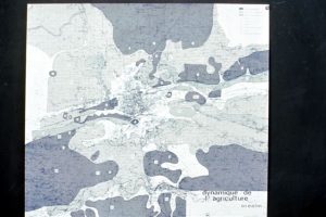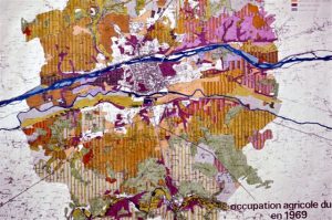 Ces cartes ont été réalisées sur un calque, où des trames de couleurs, spécifiques à chaque unité de paysage ont été appliquées. Ce choix permettait de lire et d’interpréter par superposition et transparence les divers thèmes, interrogeant ainsi la dynamique des paysages. Ci-après, deux exemples de cartes thématiques : l’occupation agricole en 1969, et la dynamique de l’agriculture autour de l’agglomération tourangelle.