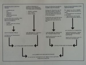 Plus tard, en 1975, le bureau d’étude « PAYSA » (Paul CLERC et Caroline BAUDELOT) réalise pour le compte du Ministère de l’Equipement, et du Ministère de la Qualité de la Vie et de l’Environnement, « une contribution à la méthodologie des études d’aménagement ». Publiée à la Documentation Française. Par ailleurs, en 1976, le CNERP (Ssuzsa CROS, Pierre DAUVERGNE, Jean-Pierre SAURIN et Sarah ZARMATI), prépare le séminaire de Cabourg « Paysage et aménagement – les approches paysagères », pour le compte du Ministère de la Qualité de la Vie. C’est dire, qu’auparavant, nous n’avions que très peu de références d’études en matière de prise en compte du paysage à des échelles régionales, les actions en la matière étant toutes nouvelles.