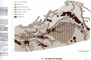 Il s’agit d’un travail méticuleux, qui s’est référé aux vues aériennes, aux cartes du CEPE, et surtout, à de nombreuses reconnaissances de terrain. Les unités ont été principalement définies par la nature du relief et l’occupation des sols. Chaque type étant identifié par une couleur (trame translucide), chacune portant un numéro renvoyant à une fiche descriptive, notamment à des croquis réalisés in situ.