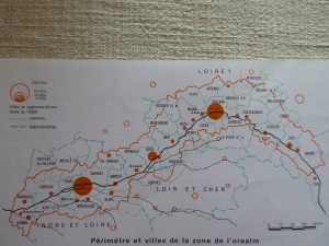 L’AIRE D’ETUDE couvre un territoire axé sur la Loire de 7 270 kms2, sur 250 kms de long et de 20 à 30 kms de large. Trois départements, le Loiret, le Loir et Cher, l’Indre et Loire, 45 cantons, et 384 communes sont concernés, soit un territoire peu commode à embrasser, d’autant que le siège de l’OREALM était basé à Orléans. Après la Décentralisation, et la création de la Région Centre, la capitale régionale a été installée à Orléans, Tours perdant ainsi de nombreuses prérogatives