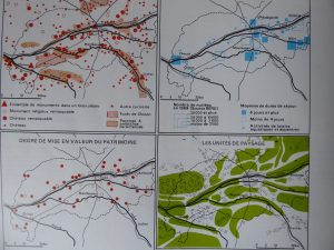 Le travail d’équipe commençant à générer des réunions de travail à un rythme soutenu, je demande au bureau d’étude PAYSA (Paul CLERC et Caroline BAUDELOT associés) de mettre à disposition de l’OREALM, à mi-temps, sur un an, Georges DEMOUCHY (Décédé en 2016). Nous entamons alors une reconnaissance systématique des paysages, à l’échelle du 1 / 100 000 -ème. Cette phase correspond encore à un travail important de terrain avec Claude Fabrizio pour identifier sur le territoire le potentiel et le degré de mise en valeur du patrimoine. De Tours à Orleans, des cartes ont recensé les éléments de ce patrimoine, leur degré de mise en valeur touristique, le degré de mise en valeur du patrimoine, enfin les unités de paysage. Ci-après les cartes portent sur les environs de Tours :