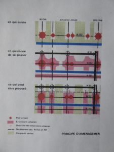 Luka SVAJBERIC et Jean-Michel AUBRY, traduisent ce principe sous la forme de deux schémas intitulés : tendances de l’urbanisation spontanée entre Tours et Orleans, et principe d’urbanisation selon un schéma linéaire discontinu. (Cahier de l’OREAM N° 3 « Une « métropole-jardin » pour la loire moyenne, ou de la ville à la région urbaine, ou métropole jardin.» – 1971).